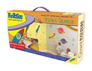 Duży zestaw naklejek z planetami – KOSMOSNaklejki renomowanej firmy FunToSee.Zestaw zawiera 64 naklejki.planeta Adastra 75cm szer. planeta Jaffa 66cm szer. planeta Fizzle 57cm szer. 53 srebrne gwiazdki fragment ziemi widziany z kosmosu 81cm wys. 5 spadających gwiazd rakieta 129cm wys.fragment „fruuuuuuuuu” 104cm wys. Naklejki są duże, zajmują razem nawet ponad 2 metry kwadratowe, oraz mieszczą się na 4 arkuszach o powierzchni 104cm x 48cm każdy. Rozpuść wodze fantazji !!!! Naklejki nie wymagają użycia kleju, wystarczy nakleić na ścianę i są łatwe do przyklejenia, oraz robią niesamowite wrażenie.Naklejki nie zostawiają śladu po ich usunięciu z powierzchni ściany….