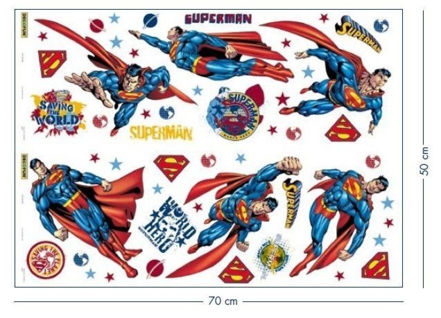 Naklejki SupermanZestaw zawiera 58 naklejek w tym 6 dużych postaci. Samoprzylepne aplikacje ścienne wielokrotnego użytku.Nadają się do przyklejenia na wszystkie gładkie i czyste powierzchnie:ściany, meble, agd, drzwi, szyby itp.Dekoracja pokoju w minutę !!!…
