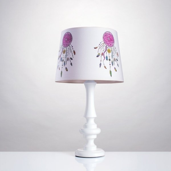 Lampa biurkowa Łapacz Snów – duża.Lampka została tak zaprojektowana aby dać Państwu najlepsze wrażenia estetyczne i wzbogacić wnętrze pokoju dziecięcego designerskim akcentem.Na abażurze widać wszystkie elementy bez cięć i łączeń zniekształcających wzory.Abażur wykonany z kretonu – 100% bawełny o splocie płóciennym.Podstawą lampy jest biała nóżka pomalowana farbą ekologiczną, jak również podklejona filcem aby nie rysowała mebli. Cała lampa jest zrobiona z podzespołów z atestami gwarantującymi bezpieczeństwo Państwa pociech. Oprócz części elektrycznych cała lampa jest zrobiona ręcznie !!! Hand made najwyższej jakości wykonany w Polsce. Lampa ma wymiary : nóżka -wysokość 35 cm, podstawa 14 cm średnicy. Abażur- w kształcie (wiadra): wysokość 23 cm, górna krawędź 26 cm średnicy, dolna krawędź 32 cm średnicy. Do lampki zalecamy użyć żarówkę o mocy max. 60 W, E27.Grafika na lampie jest autorskim pomysłem i projektem – wszelkie kopiowanie czy wykorzystanie bez wcześniejszego uzgodnienia jest zabronione….
