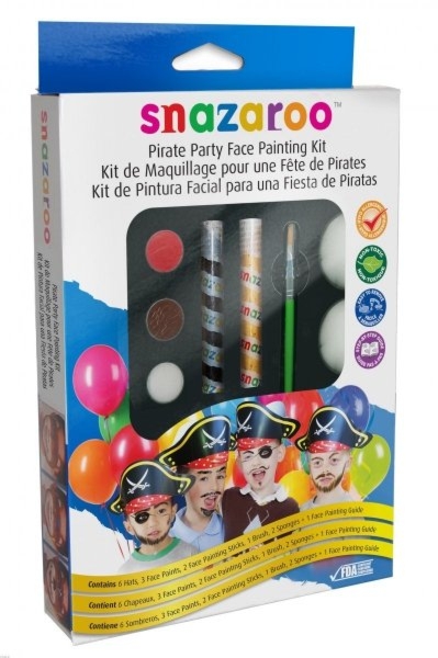Profesjonalny zestaw farb do malowania twarzy -Party – Piraci.Tematyczny zestaw farb i kredek do malowania twarzy! Pozwala zrealizować różnorodne projekty. Idealny na imprezy urodzinowe, karnawałowe itp. Zestaw ten oprócz farb i kredek zawiera również akcesoria uzupełniające przebranie. Skład zestawu:- 3 farby o pojemności 1ml w kolorach kolekcji klasycznej: czerwony, czarny, biały- 2 kredki do malowania twarzy: zielona, złota- 2 małe gąbki do nakładania farby- 1 pędzelek- wygodna paletka ze zbiorniczkiem na wodę- 6 tekturowych kapeluszy pirackich- przewodnik krok po kroku…