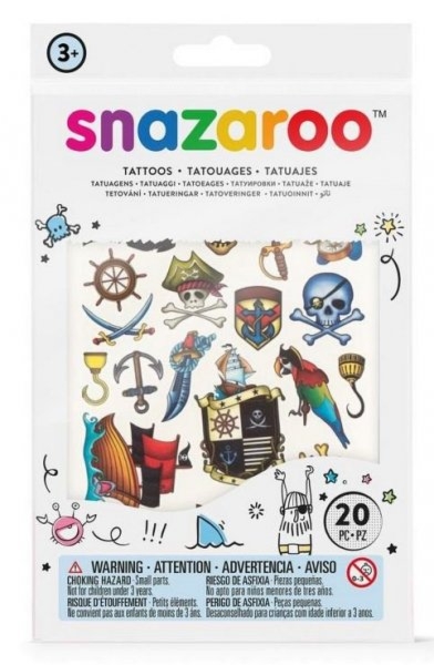 Zestaw do tatuażu Pirat SnazarooTymczasowe tatuaże utrzymujące się na skórze 7-10 dni. Arkusz zawiera 20 barwnych wzorów. Łatwe do usunięcia za pomocą środków kosmetycznych na bazie alkoholu,albo przy pomocy wacika zwilżonego dziecięcą oliwką….